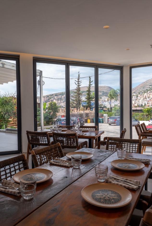 Restoranti Grand Hotel Saranda, i vendosur në një sfond